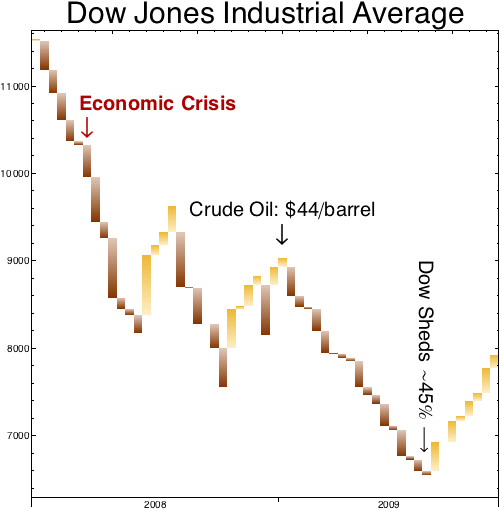 LineBreakChart[{"^DJI", {{2008, 9}, {2009, 4}}}, ImageSize -> 500, EventLabels -> {{2008, 10, 1} -> Placed[Column[{Style["Economic Crisis", 20, Bold, Darker@Red], Style["\[DownArrow]", 30, Darker@Red]}], {{0.5, 1}, {0, 0}}], {2008, 12, 30} -> Placed[Column[{Style["Crude Oil: $44/barrel", 20], Style["\[DownArrow]", 30]}, Center], {{0.5, 2}, {0.5, 0}}], {2009, 3, 6} -> Placed[Style[ Rotate["Dow Sheds ~45% \[LongRightArrow]", -90 Degree], 20], {{0.5, 5}, {0.5, 0}}]}, PlotLabel -> Style["Dow Jones Industrial Average", 30], BaseStyle -> {FontFamily -> "Helvetica"}, Axes -> {True, False}, Frame -> {{True, True}, {False, True}}, AspectRatio -> 1, TrendStyle -> "BrownYellow", ChartElementFunction -> "FadingRectangle", GridLines -> None]