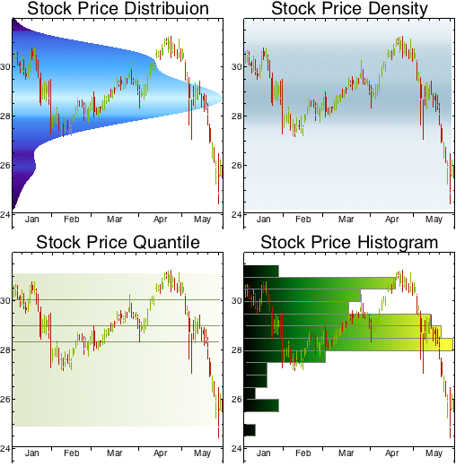 Grid[{{Show[{Graphics[Inset[g2, {0.5, 24}, {0.5, 24}, Length[close]]], CandlestickChart[data]}, AspectRatio -> 1, ImageSize -> 250, PlotRange -> {{0.5, Length[close] + 0.5}, {Min[data[[All, 2, 3]]], Max[data[[All, 2, 2]]]} + {-0.15, 0.1} (Max[data[[All, 2, 2]]] - Min[data[[All, 2, 3]]])}, Axes -> False, PlotLabel -> Style["Stock Price Distribuion", 20], Frame -> {Left, Top, Right}, BaseStyle -> {FontFamily -> "Helvetica"}], Show[{Graphics[Inset[g3, {0.5, 24}, {0, 24}, Length[close]]], CandlestickChart[data]}, AspectRatio -> 1, ImageSize -> 250, PlotRange -> {{0.5, Length[close] + 0.5}, {Min[data[[All, 2, 3]]], Max[data[[All, 2, 2]]]} + {-0.15, 0.1} (Max[data[[All, 2, 2]]] - Min[data[[All, 2, 3]]])}, Axes -> False, PlotLabel -> Style["Stock Price Density", 20], Frame -> {Left, Top, Right}, BaseStyle -> {FontFamily -> "Helvetica"}]}, {Show[{Graphics[ Inset[g4, {0.5, 24}, {0, 24}, {Length[close], l}]], CandlestickChart[data]}, AspectRatio -> 1, ImageSize -> 250, PlotRange -> {{0.5, Length[close] + 0.5}, {Min[data[[All, 2, 3]]], Max[data[[All, 2, 2]]]} + {-0.15, 0.1} (Max[data[[All, 2, 2]]] - Min[data[[All, 2, 3]]])}, Axes -> False, PlotLabel -> Style["Stock Price Quantile", 20], Frame -> {Left, Top, Right}, BaseStyle -> {FontFamily -> "Helvetica"}], Show[{Graphics[Inset[g, {0.5, 24}, {0, 24}, {Length[close], l}]], CandlestickChart[data]}, AspectRatio -> 1, ImageSize -> 250, PlotRange -> {{0.5, Length[close] + 0.5}, {Min[data[[All, 2, 3]]], Max[data[[All, 2, 2]]]} + {-0.15, 0.1} (Max[data[[All, 2, 2]]] - Min[data[[All, 2, 3]]])}, Axes -> False, PlotLabel -> Style["Stock Price Histogram", 20], Frame -> {Left, Top, Right}, BaseStyle -> {FontFamily -> "Helvetica"}]}}]