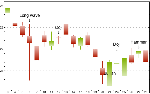 data = FinancialData["EBAY", "OHLC", {{2010, 5, 1}, {2010, 5, 31}}]; sty[label_] := Style[label, 14]; ndata = Cases[data, {date_, {o_, h_, l_, c_}} :> Which[ (*Doji*)Abs[(c - o)]/o < 0.005, Labeled[{date, {o, h, l, c}}, Column[sty /@ {"Doji", "\[DownArrow]"}, Center], Above], (*Long wave*)(h - l)/l > 0.1, Labeled[{date, {o, h, l, c}}, Column[sty /@ {"Long wave", "\[DownArrow]"}, Center], Above], (*Hammer*)(h - c)/c < 0.005 && 0 < (c - o)/o < 0.01, Labeled[{date, {o, h, l, c}}, Column[sty /@ {"Hammer", "\[DownArrow]"}, Center], Above], (*Bullish*)(c - o)/o > 0.05, Labeled[{date, {o, h, l, c}}, Column[sty /@ {"Bullish"}, Center], Center], True, {date, {o, h, l, c}}]]; CandlestickChart[ndata, ImageSize -> 500, BaseStyle -> {FontFamily -> "Helvetica"}, ChartElementFunction -> "FadingCandlestick", Frame -> {Left, Right, Top}, FrameTicks -> {{True, True}, {False, False}}, Axes -> {True, False}, PlotRangePadding -> {None, Automatic}]