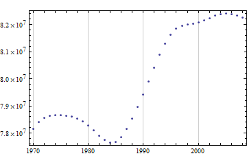 DateListPlot[\!\(\* NamespaceBox["LinguisticAssistant", DynamicModuleBox[{WolframAlphaClient`Private`query$$ = "population history of germany", WolframAlphaClient`Private`boxes$$ = RowBox[{"CountryData", "[", RowBox[{"\"Germany\"", ",", " ", RowBox[{"{", RowBox[{"\"Population\"", ",", " ", "All"}], "}"}]}], "]"}], WolframAlphaClient`Private`allassumptions$$ = {}, WolframAlphaClient`Private`assumptions$$ = {}, WolframAlphaClient`Private`open$$ = {1, 2}}, DynamicBox[ToBoxes[ AlphaIntegration`LinguisticAssistantBoxes["", 1, Dynamic[WolframAlphaClient`Private`query$$], Dynamic[WolframAlphaClient`Private`boxes$$], Dynamic[WolframAlphaClient`Private`allassumptions$$], Dynamic[WolframAlphaClient`Private`assumptions$$], Dynamic[WolframAlphaClient`Private`open$$]], StandardForm], ImageSizeCache->{337., {25., 30.}}], DynamicModuleValues:>{}], BaseStyle->{Deployed -> True}, DeleteWithContents->True, Editable->False, SelectWithContents->True]\)]