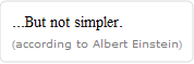 \!\(\* NamespaceBox["WolframAlphaQueryResults", DynamicModuleBox[{Typeset`q$$ = "Everything should be made as simple as possible", Typeset`opts$$ = { AppearanceElements -> { "Extrusion", "Warnings", "Assumptions", "Pods"}, Asynchronous -> All, Method -> {"ExtrusionChosen" -> { "Result", "Result", 1, 1, "Content"}, "Formats" -> { "cell", "minput", "moutput", "msound", "dataformats"}}}, Typeset`elements$$ = { "Extrusion", "Warnings", "Assumptions", "Pods"}, pod1$$ = XMLElement[ "pod", {"title" -> "Input interpretation", "scanner" -> "Identity", "id" -> "Input", "position" -> "100", "error" -> "false", "numsubpods" -> "1"}, { XMLElement["subpod", {"title" -> ""}, { XMLElement["minput", {}, {}], XMLElement["cell", {"compressed" -> False, "string" -> True}, { Cell[ BoxData[ FormBox[ TagBox[ FormBox[ TagBox[ FormBox[ FormBox[ StyleBox["\"Everything should be made as simple as possible,...\"", LinebreakAdjustments -> {1, 100, 1, 0, 100}, LineIndent -> 0, StripOnInput -> False], TraditionalForm], TraditionalForm], Format[#, TraditionalForm]& ], TraditionalForm], PolynomialForm[#, TraditionalOrder -> False]& ], TraditionalForm]], "Output"]}], XMLElement["dataformats", {}, {}]}]}], pod2$$ = XMLElement[ "pod", {"title" -> "Result", "scanner" -> "Data", "id" -> "Result", "position" -> "200", "error" -> "false", "numsubpods" -> "1", "primary" -> "true"}, { XMLElement["subpod", {"title" -> ""}, { XMLElement["cell", {"compressed" -> False, "string" -> True}, { Cell[ BoxData[ FormBox[ TagBox[ GridBox[{{ InterpretationBox[ Cell["...But not simpler."], TextCell["...But not simpler."]]}, { StyleBox[ RowBox[{"\"(\"", "", "\"according to Albert Einstein\"", "", "\")\""}], LinebreakAdjustments -> {1, 100, 1, 0, 100}, LineIndent -> 0, FontFamily -> "Verdana", GrayLevel[0.5], FontSize -> 10, StripOnInput -> False]}}, GridBoxAlignment -> {"Columns" -> {{Left}}}, GridBoxItemSize -> { "Columns" -> {{Automatic}}, "Rows" -> {{Automatic}}}], "Column"], TraditionalForm]], "Output"]}], XMLElement["dataformats", {}, {"computabledata,formatteddata"}]}]}], aux1$$ = {True, False, {False}}, aux2$$ = {True, False, {False}}, Typeset`asyncpods$$ = {}, Typeset`nonpods$$ = {}, Typeset`initdone$$ = True, Typeset`queryinfo$$ = { "success" -> "true", "error" -> "false", "numpods" -> "2", "datatypes" -> "Miscellaneous", "timedout" -> "", "timing" -> "0.474", "parsetiming" -> "0.359", "parsetimedout" -> "false", "recalculate" -> "", "version" -> "1.1"}, Typeset`sessioninfo$$ = { "TimeZone" -> -5., "Date" -> {2010, 11, 5, 14, 29, 12.6047713`8.853109926707894}, "Line" -> 18, "SessionID" -> 22924201434736041020}, Typeset`showpods$$ = {1, 2}, Typeset`failedpods$$ = {}, Typeset`chosen$$ = {"Result", "Result", 1, 1, "Content"}, Typeset`open$$ = False, Typeset`newq$$ = "Everything should be made as simple as possible"}, DynamicBox[ToBoxes[ AlphaIntegration`FormatAlphaResults[ Dynamic[{1, {pod1$$, pod2$$}, {aux1$$, aux2$$}, Typeset`chosen$$, Typeset`open$$, Typeset`elements$$, Typeset`q$$, Typeset`opts$$, Typeset`nonpods$$, Typeset`queryinfo$$, Typeset`sessioninfo$$, Typeset`showpods$$, Typeset`failedpods$$, Typeset`newq$$}]], StandardForm], ImageSizeCache->{308., {28., 18.}}, TrackedSymbols:>{Typeset`showpods$$, Typeset`failedpods$$}], DynamicModuleValues:>{}, Initialization:>If[ Not[Typeset`initdone$$], WolframAlphaClient`Private`doAsyncUpdates[ Hold[{pod1$$, pod2$$}], Typeset`asyncpods$$, Dynamic[Typeset`failedpods$$]]; Typeset`asyncpods$$ = {}; Typeset`\ initdone$$ = True], SynchronousInitialization->False], BaseStyle->{Deployed -> True}, DeleteWithContents->True, Editable->False, SelectWithContents->True]\)