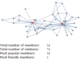 titles = Style[#, FontFamily -> "Verdana"] & /@ {"Total number of members:", "Total number of relations:", "Most popular members:", "Most friendly members:"};