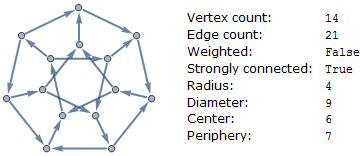 g = \!\(\* GraphicsBox[ NamespaceBox["NetworkGraphics", DynamicModuleBox[{Typeset`graph = HoldComplete[ Graph[{1, 2, 3, 4, 5, 6, 7, 8, 9, 10, 11, 12, 13, 14}, {{{1, 3}, {1, 8}, {2, 4}, {2, 7}, {3, 10}, {4, 6}, {5, 7}, {6, 13}, {7, 14}, {8, 9}, {10, 11}, {13, 14}, {14, 8}, { 6, 1}, {9, 2}, {5, 3}, {11, 4}, {12, 5}, {10, 9}, {12, 11}, {13, 12}}, Null}, { EdgeShapeFunction -> {"Arrow"}, EdgeStyle -> { Directive[ Thickness[Large], Arrowheads[Medium]]}, VertexSize -> {Medium}, VertexCoordinates -> {{0.7818314824680297, 0.6234898018587336}, { 0.9749279121818236, -0.22252093395631434`}, { 0.43388373911755823`, -0.900968867902419}, \ {-0.433883739117558, -0.9009688679024191}, {-0.9749279121818235, \ -0.2225209339563146}, {-0.7818314824680299, 0.6234898018587334}, {-2.4492935982947064`*^-16, 1.}, { 1.5636629649360594`, 1.2469796037174672`}, { 1.9498558243636472`, -0.4450418679126287}, { 0.8677674782351165, -1.801937735804838}, \ {-0.867767478235116, -1.8019377358048383`}, {-1.949855824363647, \ -0.4450418679126292}, {-1.5636629649360598`, 1.2469796037174667`}, {-4.898587196589413*^-16, 2.}}}]], Typeset`boxes = GraphicsGroupBox[{{ Directive[ Hue[0.6, 0.2, 0.8], EdgeForm[ Directive[ GrayLevel[0], Opacity[0.7]]]], TagBox[ DiskBox[{0.7818314824680297, 0.6234898018587336}, 0.08677674782351162], "DynamicName", BoxID -> "VertexID$1"], TagBox[ DiskBox[{0.9749279121818236, -0.22252093395631434`}, 0.08677674782351162], "DynamicName", BoxID -> "VertexID$2"], TagBox[ DiskBox[{0.43388373911755823`, -0.900968867902419}, 0.08677674782351162], "DynamicName", BoxID -> "VertexID$3"], TagBox[ DiskBox[{-0.433883739117558, -0.9009688679024191}, 0.08677674782351162], "DynamicName", BoxID -> "VertexID$4"], TagBox[ DiskBox[{-0.9749279121818235, -0.2225209339563146}, 0.08677674782351162], "DynamicName", BoxID -> "VertexID$5"], TagBox[ DiskBox[{-0.7818314824680299, 0.6234898018587334}, 0.08677674782351162], "DynamicName", BoxID -> "VertexID$6"], TagBox[ DiskBox[{-2.4492935982947064`*^-16, 1.}, 0.08677674782351162], "DynamicName", BoxID -> "VertexID$7"], TagBox[ DiskBox[{1.5636629649360594`, 1.2469796037174672`}, 0.08677674782351162], "DynamicName", BoxID -> "VertexID$8"], TagBox[ DiskBox[{1.9498558243636472`, -0.4450418679126287}, 0.08677674782351162], "DynamicName", BoxID -> "VertexID$9"], TagBox[ DiskBox[{0.8677674782351165, -1.801937735804838}, 0.08677674782351162], "DynamicName", BoxID -> "VertexID$10"], TagBox[ DiskBox[{-0.867767478235116, -1.8019377358048383`}, 0.08677674782351162], "DynamicName", BoxID -> "VertexID$11"], TagBox[ DiskBox[{-1.949855824363647, -0.4450418679126292}, 0.08677674782351162], "DynamicName", BoxID -> "VertexID$12"], TagBox[ DiskBox[{-1.5636629649360598`, 1.2469796037174667`}, 0.08677674782351162], "DynamicName", BoxID -> "VertexID$13"], TagBox[ DiskBox[{-4.898587196589413*^-16, 2.}, 0.08677674782351162], "DynamicName", BoxID -> "VertexID$14"]}, { Directive[ Opacity[0.7], Hue[0.6, 0.7, 0.5]], Directive[ Thickness[Large], Arrowheads[Medium]], StyleBox[{ ArrowBox[{ DynamicLocation["VertexID$1", Automatic, Center], DynamicLocation["VertexID$3", Automatic, Center]}]}, Directive[ Thickness[Large], Arrowheads[Medium]], StripOnInput -> False], StyleBox[{ ArrowBox[{ DynamicLocation["VertexID$1", Automatic, Center], DynamicLocation["VertexID$8", Automatic, Center]}]}, Directive[ Thickness[Large], Arrowheads[Medium]], StripOnInput -> False], StyleBox[{ ArrowBox[{ DynamicLocation["VertexID$2", Automatic, Center], DynamicLocation["VertexID$4", Automatic, Center]}]}, Directive[ Thickness[Large], Arrowheads[Medium]], StripOnInput -> False], StyleBox[{ ArrowBox[{ DynamicLocation["VertexID$2", Automatic, Center], DynamicLocation["VertexID$7", Automatic, Center]}]}, Directive[ Thickness[Large], Arrowheads[Medium]], StripOnInput -> False], StyleBox[{ ArrowBox[{ DynamicLocation["VertexID$3", Automatic, Center], DynamicLocation["VertexID$10", Automatic, Center]}]}, Directive[ Thickness[Large], Arrowheads[Medium]], StripOnInput -> False], StyleBox[{ ArrowBox[{ DynamicLocation["VertexID$4", Automatic, Center], DynamicLocation["VertexID$6", Automatic, Center]}]}, Directive[ Thickness[Large], Arrowheads[Medium]], StripOnInput -> False], StyleBox[{ ArrowBox[{ DynamicLocation["VertexID$5", Automatic, Center], DynamicLocation["VertexID$7", Automatic, Center]}]}, Directive[ Thickness[Large], Arrowheads[Medium]], StripOnInput -> False], StyleBox[{ ArrowBox[{ DynamicLocation["VertexID$5", Automatic, Center], DynamicLocation["VertexID$3", Automatic, Center]}]}, Directive[ Thickness[Large], Arrowheads[Medium]], StripOnInput -> False], StyleBox[{ ArrowBox[{ DynamicLocation["VertexID$6", Automatic, Center], DynamicLocation["VertexID$13", Automatic, Center]}]}, Directive[ Thickness[Large], Arrowheads[Medium]], StripOnInput -> False], StyleBox[{ ArrowBox[{ DynamicLocation["VertexID$6", Automatic, Center], DynamicLocation["VertexID$1", Automatic, Center]}]}, Directive[ Thickness[Large], Arrowheads[Medium]], StripOnInput -> False], StyleBox[{ ArrowBox[{ DynamicLocation["VertexID$7", Automatic, Center], DynamicLocation["VertexID$14", Automatic, Center]}]}, Directive[ Thickness[Large], Arrowheads[Medium]], StripOnInput -> False], StyleBox[{ ArrowBox[{ DynamicLocation["VertexID$8", Automatic, Center], DynamicLocation["VertexID$9", Automatic, Center]}]}, Directive[ Thickness[Large], Arrowheads[Medium]], StripOnInput -> False], StyleBox[{ ArrowBox[{ DynamicLocation["VertexID$9", Automatic, Center], DynamicLocation["VertexID$2", Automatic, Center]}]}, Directive[ Thickness[Large], Arrowheads[Medium]], StripOnInput -> False], StyleBox[{ ArrowBox[{ DynamicLocation["VertexID$10", Automatic, Center], DynamicLocation["VertexID$11", Automatic, Center]}]}, Directive[ Thickness[Large], Arrowheads[Medium]], StripOnInput -> False], StyleBox[{ ArrowBox[{ DynamicLocation["VertexID$10", Automatic, Center], DynamicLocation["VertexID$9", Automatic, Center]}]}, Directive[ Thickness[Large], Arrowheads[Medium]], StripOnInput -> False], StyleBox[{ ArrowBo