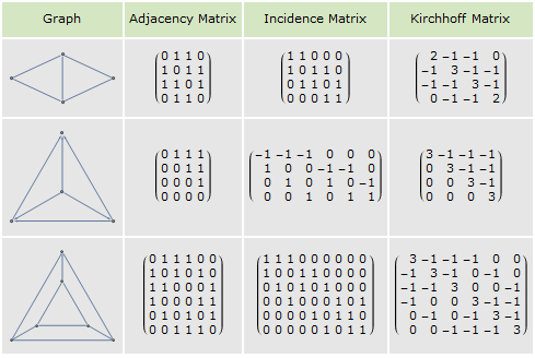 mat = {AdjacencyMatrix, IncidenceMatrix, KirchhoffMatrix};