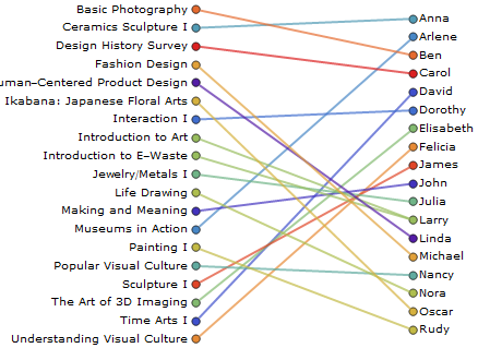 g = \!\(\* GraphicsBox[ NamespaceBox["NetworkGraphics", DynamicModuleBox[{Typeset`graph = HoldComplete[ Graph[{"Understanding Visual Culture", "Time Arts I", "The Art of 3D Imaging", "Sculpture I", "Popular Visual Culture", "Painting I", "Museums in Action", "Making and Meaning", "Life Drawing", "Jewelry/Metals I", "Introduction to E-Waste", "Introduction to Art", "Interaction I", "Ikabana: Japanese Floral Arts", "Human-Centered Product Design", "Fashion Design", "Design History Survey", "Ceramics Sculpture I", "Basic Photography", "Rudy", "Oscar", "Nora", "Nancy", "Michael", "Linda", "Larry", "Julia", "John", "James", "Felicia", "Elisabeth", "Dorothy", "David", "Carol", "Ben", "Arlene", "Anna"}, { Null, {{15, 25}, {8, 28}, {2, 33}, {19, 32}, {13, 32}, {6, 25}, {7, 36}, {8, 31}, {17, 32}, {18, 37}, {2, 21}, {5, 23}, {10, 27}, {1, 29}, {11, 32}, {18, 31}, {10, 32}, {3, 31}, {7, 26}, {4, 33}, {10, 20}, {2, 23}, {13, 26}, {12, 26}, {10, 31}, {18, 34}, {17, 31}, {11, 26}, {9, 22}, {12, 21}, {12, 25}, {7, 32}, {16, 28}, {6, 20}, {3, 34}, {4, 35}, {3, 21}, {14, 21}, {16, 24}, {11, 23}, {9, 36}, {16, 36}, {7, 35}, {16, 32}, {1, 30}, {9, 31}, {19, 35}, {1, 27}, {4, 29}, {17, 34}}}, {EdgeStyle -> { Thickness[Large]}, ImageSize -> {450, Automatic}, PlotRange -> {{-0.9, 1.3}, {-0.8, 0.8}}, VertexCoordinates -> CompressedData[" 1:eJxTTMoPSmViYGBQBWIQDQN80f8Y73m+2A/j15mstPo37Smc/443pFjuySM4 P+75v9V2hg/g/HmNwSf3/rmFpv8qmvoLaPJH0fhb4Xx0AJW3R9MP50PNR5O/ CudD3Yem/gGcD/Ufmv6ncD40fKD8D/bHjgfL5X14th/GN1v4L6zP9gmcv6xq Zf+6rodwvu6KFRPmrr8L50PMuwHnQ+y/BOdD3HsKzoe49wCcD3HfUnS+PZp6 ezTz7NHsg/Oh7oHzoe6F86H+gfOh/kUPD3sAfdS6KQ== "], VertexLabels -> {"Arlene" -> Placed[ Style["Arlene", FontFamily -> "Verdana"], After], "Museums in Action" -> Placed[ Style["Museums in Action", FontFamily -> "Verdana"], Before], "James" -> Placed[ Style["James", FontFamily -> "Verdana"], After], "Life Drawing" -> Placed[ Style["Life Drawing", FontFamily -> "Verdana"], Before], "Fashion Design" -> Placed[ Style["Fashion Design", FontFamily -> "Verdana"], Before], "Larry" -> Placed[ Style["Larry", FontFamily -> "Verdana"], After], "Julia" -> Placed[ Style["Julia", FontFamily -> "Verdana"], After], "Ceramics Sculpture I" -> Placed[ Style["Ceramics Sculpture I", FontFamily -> "Verdana"], Before], "Nora" -> Placed[ Style["Nora", FontFamily -> "Verdana"], After], "Time Arts I" -> Placed[ Style["Time Arts I", FontFamily -> "Verdana"], Before], "Elisabeth" -> Placed[ Style["Elisabeth", FontFamily -> "Verdana"], After], "John" -> Placed[ Style["John", FontFamily -> "Verdana"], After], "Linda" -> Placed[ Style["Linda", FontFamily -> "Verdana"], After], "Human-Centered Product Design" -> Placed[ Style["Human-Centered Product Design", FontFamily -> "Verdana"], Before], "Rudy" -> Placed[ Style["Rudy", FontFamily -> "Verdana"], After], "Painting I" -> Placed[ Style["Painting I", FontFamily -> "Verdana"], Before], "Basic Photography" -> Placed[ Style["Basic Photography", FontFamily -> "Verdana"], Before], "David" -> Placed[ Style["David", FontFamily -> "Verdana"], After], "Jewelry/Metals I" -> Placed[ Style["Jewelry/Metals I", FontFamily -> "Verdana"], Before], "Ben" -> Placed[ Style["Ben", FontFamily -> "Verdana"], After], "Carol" -> Placed[ Style["Carol", FontFamily -> "Verdana"], After], "Making and Meaning" -> Placed[ Style["Making and Meaning", FontFamily -> "Verdana"], Before], "Anna" -> Placed[ Style["Anna", FontFamily -> "Verdana"], After], "Oscar" -> Placed[ Style["Oscar", FontFamily -> "Verdana"], After], "Interaction I" -> Placed[ Style["Interaction I", FontFamily -> "Verdana"], Before], "The Art of 3D Imaging" -> Placed[ Style["The Art of 3D Imaging", FontFamily -> "Verdana"], Before], "Understanding Visual Culture" -> Placed[ Style["Understanding Visual Culture", FontFamily -> "Verdana"], Before], "Introduction to Art" -> Placed[ Style["Introduction to Art", FontFamily -> "Verdana"], Before], "Felicia" -> Placed[ Style["Felicia", FontFamily -> "Verdana"], After], "Nancy" -> Placed[ Style["Nancy", FontFamily -> "Verdana"], After], "Sculpture I" -> Placed[ Style["Sculpture I", FontFamily -> "Verdana"], Before], "Ikabana: Japanese Floral Arts" -> Placed[ Style["Ikabana: Japanese Floral Arts", FontFamily -> "Verdana"], Before], "Dorothy" -> Placed[ Style["Dorothy", FontFamily -> "Verdana"], After], "Introduction to E-Waste" -> Placed[ Style["Introduction to E-Waste", FontFamily -> "Verdana"], Before], "Popular Visual Culture" -> Placed[ Style["Popular Visual Culture", FontFamily -> "Verdana"], Before], "Michael" -> Placed[ Style["Michael", FontFamily -> "Verdana"], After], "Design History Survey" -> Placed[ Style["Design History Survey", FontFamily -> "Verdana"], Before]}}]], Typeset`boxes = GraphicsGroupBox[{{ Directive[ Hue[0.6, 0.2, 0.8], EdgeForm[ Directive[ GrayLevel[0], Opacity[0.7]]]], TagBox[{ TagBox[ DiskBox[{0., -0.7590169943749474}, 0.01857697903168551], "DynamicName", BoxID -> "VertexID$1"], InsetBox[ FormBox[ StyleBox["\"Understanding Visual Culture\"", FontFamily -> "Verdana", StripOnInput -> False], TraditionalForm], Offset[{-2, 0}, DynamicLocation["VertexID$1", Automatic, Left]], ImageScaled[{1, 0.5}], BaseStyle -> "Graphics"]}, "DynamicName", BoxID -> "VertexLabelID$1"], TagBox[{ TagBox[ DiskBox[{0., -0.674681772777731}, 0.01857697903168551], "DynamicName", BoxID -> "VertexID$2"], InsetBox[ FormBox[ StyleBox["\"Time Arts I\"", FontFamily -> "Verdana", StripOnInput -> False], TraditionalForm], Offset[{-2, 0}, DynamicLocation["VertexID$2", Automatic, Left]], ImageScaled[{1, 0.5}], BaseStyle -> "Graphics"]}, "DynamicName", BoxID -> "VertexLabelID$2"], TagBox[{ TagBox[ DiskBox[{0., -0.5903465511805146}, 0.01857697903168551], "DynamicName", BoxID -> "VertexID$3"], InsetBox[ FormBox[ StyleBox["\"The Art of 3D Imaging\"", FontFamily -> "Verdana", StripOnInput -> False], TraditionalForm], Offset[{-2, 0}, DynamicLocation["VertexID$3", Automatic, Left]], ImageScaled[{1, 0.5}], BaseStyle -> "Graphics"]}, "DynamicName", BoxID -> "Verte
