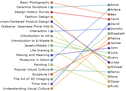 g = \!\(\* GraphicsBox[ NamespaceBox["NetworkGraphics", DynamicModuleBox[{Typeset`graph = HoldComplete[ Graph[{"Understanding Visual Culture", "Time Arts I", "The Art of 3D Imaging", "Sculpture I", "Popular Visual Culture", "Painting I", "Museums in Action", "Making and Meaning", "Life Drawing", "Jewelry/Metals I", "Introduction to E-Waste", "Introduction to Art", "Interaction I", "Ikabana: Japanese Floral Arts", "Human-Centered Product Design", "Fashion Design", "Design History Survey", "Ceramics Sculpture I", "Basic Photography", "Rudy", "Oscar", "Nora", "Nancy", "Michael", "Linda", "Larry", "Julia", "John", "James", "Felicia", "Elisabeth", "Dorothy", "David", "Carol", "Ben", "Arlene", "Anna"}, { Null, {{15, 25}, {8, 28}, {2, 33}, {19, 32}, {13, 32}, {6, 25}, {7, 36}, {8, 31}, {17, 32}, {18, 37}, {2, 21}, {5, 23}, {10, 27}, {1, 29}, {11, 32}, {18, 31}, {10, 32}, {3, 31}, {7, 26}, {4, 33}, {10, 20}, {2, 23}, {13, 26}, {12, 26}, {10, 31}, {18, 34}, {17, 31}, {11, 26}, {9, 22}, {12, 21}, {12, 25}, {7, 32}, {16, 28}, {6, 20}, {3, 34}, {4, 35}, {3, 21}, {14, 21}, {16, 24}, {11, 23}, {9, 36}, {16, 36}, {7, 35}, {16, 32}, {1, 30}, {9, 31}, {19, 35}, {1, 27}, {4, 29}, {17, 34}}}, {EdgeStyle -> { Thickness[Large]}, ImageSize -> {450, Automatic}, PlotRange -> {{-0.9, 1.3}, {-0.8, 0.8}}, VertexCoordinates -> CompressedData[" 1:eJxTTMoPSmViYGBQBWIQDQN80f8Y73m+2A/j15mstPo37Smc/443pFjuySM4 P+75v9V2hg/g/HmNwSf3/rmFpv8qmvoLaPJH0fhb4Xx0AJW3R9MP50PNR5O/ CudD3Yem/gGcD/Ufmv6ncD40fKD8D/bHjgfL5X14th/GN1v4L6zP9gmcv6xq Zf+6rodwvu6KFRPmrr8L50PMuwHnQ+y/BOdD3HsKzoe49wCcD3HfUnS+PZp6 ezTz7NHsg/Oh7oHzoe6F86H+gfOh/kUPD3sAfdS6KQ== "], VertexLabels -> {"Arlene" -> Placed[ Style["Arlene", FontFamily -> "Verdana"], After], "Museums in Action" -> Placed[ Style["Museums in Action", FontFamily -> "Verdana"], Before], "James" -> Placed[ Style["James", FontFamily -> "Verdana"], After], "Life Drawing" -> Placed[ Style["Life Drawing", FontFamily -> "Verdana"], Before], "Fashion Design" -> Placed[ Style["Fashion Design", FontFamily -> "Verdana"], Before], "Larry" -> Placed[ Style["Larry", FontFamily -> "Verdana"], After], "Julia" -> Placed[ Style["Julia", FontFamily -> "Verdana"], After], "Ceramics Sculpture I" -> Placed[ Style["Ceramics Sculpture I", FontFamily -> "Verdana"], Before], "Nora" -> Placed[ Style["Nora", FontFamily -> "Verdana"], After], "Time Arts I" -> Placed[ Style["Time Arts I", FontFamily -> "Verdana"], Before], "Elisabeth" -> Placed[ Style["Elisabeth", FontFamily -> "Verdana"], After], "John" -> Placed[ Style["John", FontFamily -> "Verdana"], After], "Linda" -> Placed[ Style["Linda", FontFamily -> "Verdana"], After], "Human-Centered Product Design" -> Placed[ Style["Human-Centered Product Design", FontFamily -> "Verdana"], Before], "Rudy" -> Placed[ Style["Rudy", FontFamily -> "Verdana"], After], "Painting I" -> Placed[ Style["Painting I", FontFamily -> "Verdana"], Before], "Basic Photography" -> Placed[ Style["Basic Photography", FontFamily -> "Verdana"], Before], "David" -> Placed[ Style["David", FontFamily -> "Verdana"], After], "Jewelry/Metals I" -> Placed[ Style["Jewelry/Metals I", FontFamily -> "Verdana"], Before], "Ben" -> Placed[ Style["Ben", FontFamily -> "Verdana"], After], "Carol" -> Placed[ Style["Carol", FontFamily -> "Verdana"], After], "Making and Meaning" -> Placed[ Style["Making and Meaning", FontFamily -> "Verdana"], Before], "Anna" -> Placed[ Style["Anna", FontFamily -> "Verdana"], After], "Oscar" -> Placed[ Style["Oscar", FontFamily -> "Verdana"], After], "Interaction I" -> Placed[ Style["Interaction I", FontFamily -> "Verdana"], Before], "The Art of 3D Imaging" -> Placed[ Style["The Art of 3D Imaging", FontFamily -> "Verdana"], Before], "Understanding Visual Culture" -> Placed[ Style["Understanding Visual Culture", FontFamily -> "Verdana"], Before], "Introduction to Art" -> Placed[ Style["Introduction to Art", FontFamily -> "Verdana"], Before], "Felicia" -> Placed[ Style["Felicia", FontFamily -> "Verdana"], After], "Nancy" -> Placed[ Style["Nancy", FontFamily -> "Verdana"], After], "Sculpture I" -> Placed[ Style["Sculpture I", FontFamily -> "Verdana"], Before], "Ikabana: Japanese Floral Arts" -> Placed[ Style["Ikabana: Japanese Floral Arts", FontFamily -> "Verdana"], Before], "Dorothy" -> Placed[ Style["Dorothy", FontFamily -> "Verdana"], After], "Introduction to E-Waste" -> Placed[ Style["Introduction to E-Waste", FontFamily -> "Verdana"], Before], "Popular Visual Culture" -> Placed[ Style["Popular Visual Culture", FontFamily -> "Verdana"], Before], "Michael" -> Placed[ Style["Michael", FontFamily -> "Verdana"], After], "Design History Survey" -> Placed[ Style["Design History Survey", FontFamily -> "Verdana"], Before]}}]], Typeset`boxes = GraphicsGroupBox[{{ Directive[ Hue[0.6, 0.2, 0.8], EdgeForm[ Directive[ GrayLevel[0], Opacity[0.7]]]], TagBox[{ TagBox[ DiskBox[{0., -0.7590169943749474}, 0.01857697903168551], "DynamicName", BoxID -> "VertexID$1"], InsetBox[ FormBox[ StyleBox["\"Understanding Visual Culture\"", FontFamily -> "Verdana", StripOnInput -> False], TraditionalForm], Offset[{-2, 0}, DynamicLocation["VertexID$1", Automatic, Left]], ImageScaled[{1, 0.5}], BaseStyle -> "Graphics"]}, "DynamicName", BoxID -> "VertexLabelID$1"], TagBox[{ TagBox[ DiskBox[{0., -0.674681772777731}, 0.01857697903168551], "DynamicName", BoxID -> "VertexID$2"], InsetBox[ FormBox[ StyleBox["\"Time Arts I\"", FontFamily -> "Verdana", StripOnInput -> False], TraditionalForm], Offset[{-2, 0}, DynamicLocation["VertexID$2", Automatic, Left]], ImageScaled[{1, 0.5}], BaseStyle -> "Graphics"]}, "DynamicName", BoxID -> "VertexLabelID$2"], TagBox[{ TagBox[ DiskBox[{0., -0.5903465511805146}, 0.01857697903168551], "DynamicName", BoxID -> "VertexID$3"], InsetBox[ FormBox[ StyleBox["\"The Art of 3D Imaging\"", FontFamily -> "Verdana", StripOnInput -> False], TraditionalForm], Offset[{-2, 0}, DynamicLocation["VertexID$3", Automatic, Left]], ImageScaled[{1, 0.5}], BaseStyle -> "Graphics"]}, "DynamicName", BoxID -> "Verte