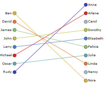 g = \!\(\* GraphicsBox[ NamespaceBox["NetworkGraphics", DynamicModuleBox[{Typeset`graph = HoldComplete[ Graph[{"Rudy", "Oscar", "Michael", "Larry", "John", "James", "David", "Ben", "Nora", "Nancy", "Linda", "Julia", "Felicia", "Elisabeth", "Dorothy", "Carol", "Arlene", "Anna"}, { Null, {{7, 10}, {4, 11}, {1, 18}, {6, 17}, {4, 14}, {2, 16}, {2, 12}, {4, 18}, {6, 13}, {8, 15}, {5, 15}, {4, 15}, { 3, 18}, {7, 17}, {8, 9}, {7, 11}, {5, 16}, {4, 10}, {6, 10}, {3, 17}}}, {EdgeStyle -> { Thickness[Large]}, ImageSize -> {350, Automatic}, PlotRange -> {{-0.2, 1.3}, {-0.6, 0.6}}, VertexCoordinates -> {{0., -0.4153465511805146}, { 0., -0.29667610798608185`}, {0., -0.17800566479164912`}, { 0., -0.059335221597216374`}, {0., 0.059335221597216374`}, { 0., 0.17800566479164912`}, {0., 0.29667610798608185`}, {0., 0.4153465511805146}, {1., -0.5340169943749473}, { 1., -0.4153465511805146}, {1., -0.29667610798608185`}, { 1., -0.17800566479164912`}, {1., -0.059335221597216374`}, { 1., 0.059335221597216374`}, {1., 0.17800566479164912`}, { 1., 0.29667610798608185`}, {1., 0.4153465511805146}, {1., 0.5340169943749473}}, VertexLabels -> {"Nancy" -> Placed[ Style["Nancy", FontFamily -> "Verdana"], After], "Michael" -> Placed[ Style["Michael", FontFamily -> "Verdana"], Before], "Oscar" -> Placed[ Style["Oscar", FontFamily -> "Verdana"], Before], "David" -> Placed[ Style["David", FontFamily -> "Verdana"], Before], "Rudy" -> Placed[ Style["Rudy", FontFamily -> "Verdana"], Before], "Larry" -> Placed[ Style["Larry", FontFamily -> "Verdana"], Before], "Arlene" -> Placed[ Style["Arlene", FontFamily -> "Verdana"], After], "James" -> Placed[ Style["James", FontFamily -> "Verdana"], Before], "Anna" -> Placed[ Style["Anna", FontFamily -> "Verdana"], After], "John" -> Placed[ Style["John", FontFamily -> "Verdana"], Before], "Felicia" -> Placed[ Style["Felicia", FontFamily -> "Verdana"], After], "Linda" -> Placed[ Style["Linda", FontFamily -> "Verdana"], After], "Nora" -> Placed[ Style["Nora", FontFamily -> "Verdana"], After], "Julia" -> Placed[ Style["Julia", FontFamily -> "Verdana"], After], "Dorothy" -> Placed[ Style["Dorothy", FontFamily -> "Verdana"], After], "Carol" -> Placed[ Style["Carol", FontFamily -> "Verdana"], After], "Ben" -> Placed[ Style["Ben", FontFamily -> "Verdana"], Before], "Elisabeth" -> Placed[ Style["Elisabeth", FontFamily -> "Verdana"], After]}, VertexSize -> {Large}}]], Typeset`boxes = GraphicsGroupBox[{{ Directive[ Hue[0.6, 0.2, 0.8], EdgeForm[ Directive[ GrayLevel[0], Opacity[0.7]]]], TagBox[{ TagBox[ DiskBox[{0., -0.4153465511805146}, 0.02373408863888654], "DynamicName", BoxID -> "VertexID$1"], InsetBox[ FormBox[ StyleBox["\"Rudy\"", FontFamily -> "Verdana", StripOnInput -> False], TraditionalForm], Offset[{-2, 0}, DynamicLocation["VertexID$1", Automatic, Left]], ImageScaled[{1, 0.5}], BaseStyle -> "Graphics"]}, "DynamicName", BoxID -> "VertexLabelID$1"], TagBox[{ TagBox[ DiskBox[{0., -0.29667610798608185`}, 0.02373408863888654], "DynamicName", BoxID -> "VertexID$2"], InsetBox[ FormBox[ StyleBox["\"Oscar\"", FontFamily -> "Verdana", StripOnInput -> False], TraditionalForm], Offset[{-2, 0}, DynamicLocation["VertexID$2", Automatic, Left]], ImageScaled[{1, 0.5}], BaseStyle -> "Graphics"]}, "DynamicName", BoxID -> "VertexLabelID$2"], TagBox[{ TagBox[ DiskBox[{0., -0.17800566479164912`}, 0.02373408863888654], "DynamicName", BoxID -> "VertexID$3"], InsetBox[ FormBox[ StyleBox["\"Michael\"", FontFamily -> "Verdana", StripOnInput -> False], TraditionalForm], Offset[{-2, 0}, DynamicLocation["VertexID$3", Automatic, Left]], ImageScaled[{1, 0.5}], BaseStyle -> "Graphics"]}, "DynamicName", BoxID -> "VertexLabelID$3"], TagBox[{ TagBox[ DiskBox[{0., -0.059335221597216374`}, 0.02373408863888654], "DynamicName", BoxID -> "VertexID$4"], InsetBox[ FormBox[ StyleBox["\"Larry\"", FontFamily -> "Verdana", StripOnInput -> False], TraditionalForm], Offset[{-2, 0}, DynamicLocation["VertexID$4", Automatic, Left]], ImageScaled[{1, 0.5}], BaseStyle -> "Graphics"]}, "DynamicName", BoxID -> "VertexLabelID$4"], TagBox[{ TagBox[ DiskBox[{0., 0.059335221597216374`}, 0.02373408863888654], "DynamicName", BoxID -> "VertexID$5"], InsetBox[ FormBox[ StyleBox["\"John\"", FontFamily -> "Verdana", StripOnInput -> False], TraditionalForm], Offset[{-2, 0}, DynamicLocation["VertexID$5", Automatic, Left]], ImageScaled[{1, 0.5}], BaseStyle -> "Graphics"]}, "DynamicName", BoxID -> "VertexLabelID$5"], TagBox[{ TagBox[ DiskBox[{0., 0.17800566479164912`}, 0.02373408863888654], "DynamicName", BoxID -> "VertexID$6"], InsetBox[ FormBox[ StyleBox["\"James\"", FontFamily -> "Verdana", StripOnInput -> False], TraditionalForm], Offset[{-2, 0}, DynamicLocation["VertexID$6", Automatic, Left]], ImageScaled[{1, 0.5}], BaseStyle -> "Graphics"]}, "DynamicName", BoxID -> "VertexLabelID$6"], TagBox[{ TagBox[ DiskBox[{0., 0.29667610798608185`}, 0.02373408863888654], "DynamicName", BoxID -> "VertexID$7"], InsetBox[ FormBox[ StyleBox["\"David\"", FontFamily -> "Verdana", StripOnInput -> False], TraditionalForm], Offset[{-2, 0}, DynamicLocation["VertexID$7", Automatic, Left]], ImageScaled[{1, 0.5}], BaseStyle -> "Graphics"]}, "DynamicName", BoxID -> "VertexLabelID$7"], TagBox[{ TagBox[ DiskBox[{0., 0.4153465511805146}, 0.02373408863888654], "DynamicName", BoxID -> "VertexID$8"], InsetBox[ FormBox[ StyleBox["\"Ben\"", FontFamily -> "Verdana", StripOnInput -> False], TraditionalForm], Offset[{-2, 0}, DynamicLocation["VertexID$8", Automatic, Left]], ImageScaled[{1, 0.5}], BaseStyle -> "Graphics"]}, "DynamicName", BoxID -> "VertexLabelID$8"], TagBox[{ TagBox[ DiskBox[{1., -0.5340169943749473}, 0.02373408863888654], "DynamicName", BoxID -> "VertexID$9"], InsetBox[ FormBox[ StyleBox["\"Nora\"", FontFamily -> "Verdana", StripOnInput -> False], TraditionalForm], Offset[{2, 0}, DynamicLocation["VertexID$9", Automatic, Right]], ImageScaled[{0, 0.5}], BaseStyle -> "Graphics"]}, "DynamicName", BoxID -> "VertexLabelID$9"], TagBox[{ TagBox[ DiskBox[{1., -0.4153465511805146}, 0.02