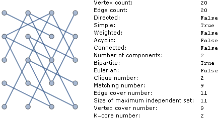 Row[{g, Grid[{ {text["Vertex count: "], ToString[VertexCount[g]]}, {text["Edge count: "], ToString[EdgeCount[g]]}, {text["Directed: "], ToString[DirectedGraphQ[g]]}, {text["Simple: "], ToString[SimpleGraphQ[g]]}, {text["Weighted: "], ToString[WeightedGraphQ[g]]}, {text["Acyclic: "], ToString[AcyclicGraphQ[g]]}, {text["Connected: "], ToString[ConnectedGraphQ[g]]}, {text["Number of components: "], ToString@Length[ConnectedComponents[g]]}, {text["Bipartite: "], ToString[BipartiteGraphQ[g]]}, {text["Eulerian: "], ToString[EulerianGraphQ[g]]}, {text["Clique number: "], ToString[Length@FindClique[g][[1]]]}, {text["Matching number: "], ToString[Length@FindIndependentEdgeSet[g]]}, {text["Edge cover number: "], ToString[Length@FindEdgeCover[g]]}, {text["Size of maximum independent set: "], ToString[Length@FindIndependentVertexSet[g]]}, {text["Vertex cover number: "], ToString[Length@FindVertexCover[g]]}, {text["K-core number: "], ToString[ Module[{i = 1}, While[KCoreComponents[g, i] != {}, ++i]; i - 1]]}}, Alignment -> Left]}, Spacer[20]]