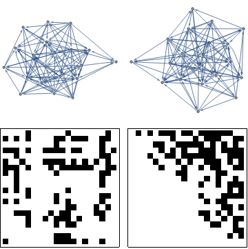 GraphicsGrid[({#, ArrayPlot[AdjacencyMatrix[#]]} & /@ {g, h})\[Transpose], ImageSize -> 400]