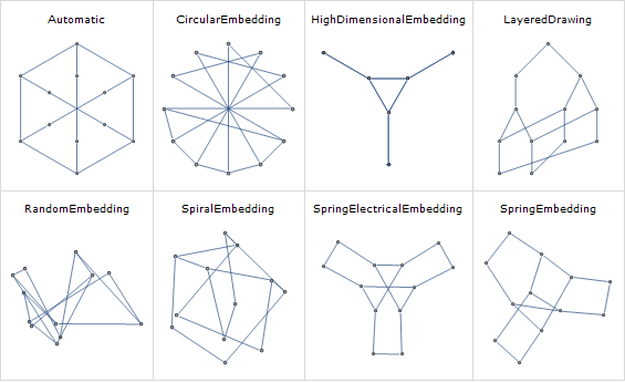 layout = {Automatic, "CircularEmbedding", "HighDimensionalEmbedding", "LayeredDrawing", "RandomEmbedding", "SpiralEmbedding", "SpringElectricalEmbedding", "SpringEmbedding"};