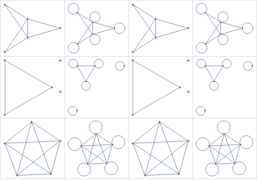 Grid[Partition[Drop[Table[BooleanGraph[BooleanFunction[i, 2], \!\(\* GraphicsBox[ NamespaceBox["NetworkGraphics", DynamicModuleBox[{Typeset`graph = HoldComplete[ Graph[{1, 2, 3, 4, 5}, {Null, SparseArray[ Automatic, {5, 5}, 0, { 1, {{0, 4, 8, 12, 16, 20}, {{2}, {3}, {4}, {5}, {1}, { 3}, {4}, {5}, {1}, {2}, {4}, {5}, {1}, {2}, {3}, { 5}, {1}, {2}, {3}, {4}}}, Pattern}]}, { FrameTicks -> None, VertexCoordinates -> {{0.9510565162951535, 0.30901699437494745`}, { 0.5877852522924732, -0.8090169943749473}, \ {-0.587785252292473, -0.8090169943749475}, {-0.9510565162951536, 0.30901699437494723`}, {-2.4492935982947064`*^-16, 1.}}}]], Typeset`boxes = GraphicsGroupBox[{{ Directive[ Hue[0.6, 0.2, 0.8], EdgeForm[ Directive[ GrayLevel[0], Opacity[0.7]]]], TagBox[ DiskBox[{0.9510565162951535, 0.30901699437494745`}, 0.021812234931106983`], "DynamicName", BoxID -> "VertexID$1"], TagBox[ DiskBox[{0.5877852522924732, -0.8090169943749473}, 0.021812234931106983`], "DynamicName", BoxID -> "VertexID$2"], TagBox[ DiskBox[{-0.587785252292473, -0.8090169943749475}, 0.021812234931106983`], "DynamicName", BoxID -> "VertexID$3"], TagBox[ DiskBox[{-0.9510565162951536, 0.30901699437494723`}, 0.021812234931106983`], "DynamicName", BoxID -> "VertexID$4"], TagBox[ DiskBox[{-2.4492935982947064`*^-16, 1.}, 0.021812234931106983`], "DynamicName", BoxID -> "VertexID$5"]}, { Directive[ Opacity[0.7], Hue[0.6, 0.7, 0.5]], LineBox[{{ DynamicLocation["VertexID$1", Automatic, Center], DynamicLocation["VertexID$2", Automatic, Center]}, { DynamicLocation["VertexID$1", Automatic, Center], DynamicLocation["VertexID$3", Automatic, Center]}, { DynamicLocation["VertexID$1", Automatic, Center], DynamicLocation["VertexID$4", Automatic, Center]}, { DynamicLocation["VertexID$1", Automatic, Center], DynamicLocation["VertexID$5", Automatic, Center]}, { DynamicLocation["VertexID$2", Automatic, Center], DynamicLocation["VertexID$3", Automatic, Center]}, { DynamicLocation["VertexID$2", Automatic, Center], DynamicLocation["VertexID$4", Automatic, Center]}, { DynamicLocation["VertexID$2", Automatic, Center], DynamicLocation["VertexID$5", Automatic, Center]}, { DynamicLocation["VertexID$3", Automatic, Center], DynamicLocation["VertexID$4", Automatic, Center]}, { DynamicLocation["VertexID$3", Automatic, Center], DynamicLocation["VertexID$5", Automatic, Center]}, { DynamicLocation["VertexID$4", Automatic, Center], DynamicLocation["VertexID$5", Automatic, Center]}}]}}]}, DynamicBox[GraphComputation`NetworkGraphicsBox[ 1, Typeset`graph, Typeset`boxes], { CachedValue :> Typeset`boxes, SingleEvaluation -> True, SynchronousUpdating -> False, TrackedSymbols :> {}}, ImageSizeCache->{{0.42661182897877303`, 88.57338817102124}, {-44.64458817102121, 39.41421356237309}}]]], DefaultBaseStyle->{ "NetworkGraphics", FrontEnd`GraphicsHighlightColor -> Hue[0.8, 1., 0.6]}, FrameTicks->None]\), \!\(\* GraphicsBox[ NamespaceBox["NetworkGraphics", DynamicModuleBox[{Typeset`graph = HoldComplete[ Graph[{1, 2, 3}, {Null, SparseArray[ Automatic, {3, 3}, 0, { 1, {{0, 2, 4, 6}, {{2}, {3}, {1}, {3}, {1}, {2}}}, Pattern}]}, { FrameTicks -> None, VertexCoordinates -> {{ 0.8660254037844387, -0.4999999999999998}, \ {-0.8660254037844385, -0.5000000000000004}, \ {-2.4492935982947064`*^-16, 1.}}}]], Typeset`boxes = GraphicsGroupBox[{{ Directive[ Hue[0.6, 0.2, 0.8], EdgeForm[ Directive[ GrayLevel[0], Opacity[0.7]]]], TagBox[ DiskBox[{0.8660254037844387, -0.4999999999999998}, 0.020399597244776385`], "DynamicName", BoxID -> "VertexID$1"], TagBox[ DiskBox[{-0.8660254037844385, -0.5000000000000004}, 0.020399597244776385`], "DynamicName", BoxID -> "VertexID$2"], TagBox[ DiskBox[{-2.4492935982947064`*^-16, 1.}, 0.020399597244776385`], "DynamicName", BoxID -> "VertexID$3"]}, { Directive[ Opacity[0.7], Hue[0.6, 0.7, 0.5]], LineBox[{{ DynamicLocation["VertexID$1", Automatic, Center], DynamicLocation["VertexID$2", Automatic, Center]}, { DynamicLocation["VertexID$1", Automatic, Center], DynamicLocation["VertexID$3", Automatic, Center]}, { DynamicLocation["VertexID$2", Automatic, Center], DynamicLocation["VertexID$3", Automatic, Center]}}]}}]}, DynamicBox[GraphComputation`NetworkGraphicsBox[ 1, Typeset`graph, Typeset`boxes], { CachedValue :> Typeset`boxes, SingleEvaluation -> True, SynchronousUpdating -> False, TrackedSymbols :> {}}, ImageSizeCache->{{0.7800000000000016, 88.22}, {-41.2912, 34.965439323312935`}}]]], DefaultBaseStyle->{ "NetworkGraphics", FrontEnd`GraphicsHighlightColor -> Hue[0.8, 1., 0.6]}, FrameTicks->None]\), ImageSize -> 120], {i, 0, 15}], 4], 4], Frame -> All, FrameStyle -> LightGray]