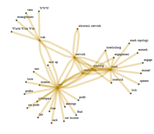 edges = Flatten[ Rest[NestList[ Union[Flatten[ Thread[# -> WordData[#, "Synonyms", "List"]] & /@ Last /@ #]] &, {"" -> "network"}, 2]]];