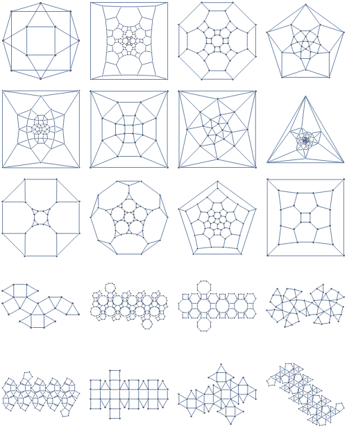 skeletons = Partition[ PolyhedronData[#, "SkeletonGraph"] & /@ PolyhedronData["Archimedean"], 4];