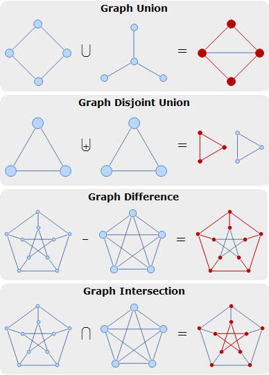 info = { {g = CycleGraph[4, style], Style["\[Union]", 20], h = StarGraph[4, style], Style["\[LongEqual]", 20], HighlightGraph[ GraphUnion[g, h, GraphLayout -> "CircularEmbedding"], g, style]}, {g = CycleGraph[3, style], Style["\[UnionPlus]", 20], h = CycleGraph[3, style], Style["\[LongEqual]", 20], HighlightGraph[GraphDisjointUnion[g, h], g, style]}, {g = PetersenGraph[5, 2, style], Style["-", 20], h = CompleteGraph[5, style], Style["\[LongEqual]", 20], HighlightGraph[g, GraphDifference[g, h], style]}, {g = PetersenGraph[5, 2, style], Style["\[Intersection]", 20], h = CompleteGraph[5, style], Style["\[LongEqual]", 20], HighlightGraph[g, GraphIntersection[g, h], style]} };