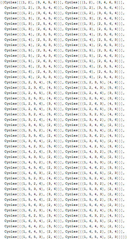 GroupOrbits[AlternatingGroup[6], {Cycles[{{1, 2}, {3, 4, 5, 6}}]}]
