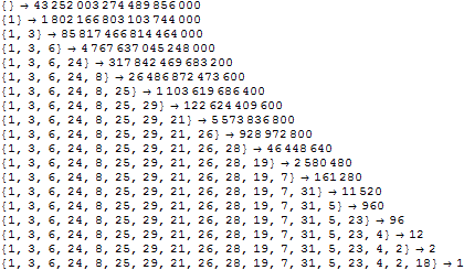 GroupStabilizerChain[RubikGroup] /. gr_PermutationGroup :> GroupOrder[gr] // Column