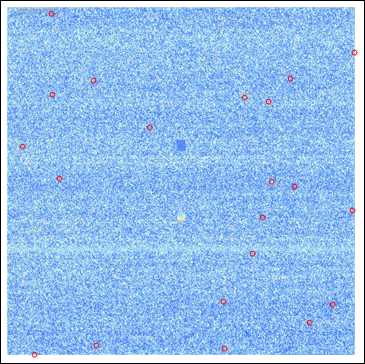 {data, outliers} = Import["http://www.affymetrix.com/support/downloads/demo_data/Demo_\ Data_Cotton_AGCC.zip", \ {"Demo_Data_Cotton_AGCC\\af1c837-3-17_1_3_11-261006.CEL", {"Data", "Outliers"}}]; Show[ArrayPlot[Log@data, ColorFunction -> "LightTemperatureMap"], Graphics[{Red, Circle[#, 5.0] & /@ outliers}]]