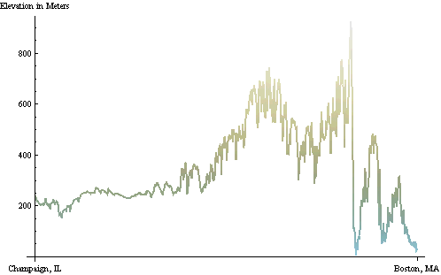 elevationData = Import[ "http://maps.googleapis.com/maps/api/elevation/json?path=40.1130,-\ 88.2611|42.3216,-71.0891&samples=500&sensor=false", "JSON"]; ListPlot[Cases[elevationData, HoldPattern["elevation" -> value_] :> value, Infinity], Joined -> True, ColorFunction -> ColorData["LightTerrain"], PlotStyle -> Thick, AxesLabel -> {None, "Elevation in Meters"}, Ticks -> {{{0, "Champaign, IL", {0, .01}}, {500, "Boston, MA", {0, .01}}}, Automatic}]