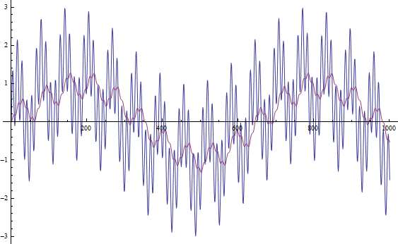 Ejecute el ejecutable, analice la salida y diagrame la señal original (azul) con la señal de filtro paso bajo (roja).