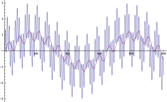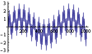 Теперь эту программу можно распространять и исполнять за пределами системы Mathematica. Ее также можно исполнять в системе Mathematica для тестирования и демонстрирования. Создадим входной сигнал с несколькими частотными компонентами.