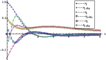 {a, b, c} = {( { {0.81, -0.23, -0.045}, {0.09, 0.98, -0.0023}, {0.005, 0.1, 1} } ), ( { {0.09}, {0.0047}, {0.00016} } ), ( { {1, 3.5, 3} } )}; ss = StateSpaceModel[{a, b, c}, SamplingPeriod -> 0.1]; l = EstimatorGains[ss, {0.5, 0.6, 0.75}]; ssobsv = StateSpaceModel[{a - l.c, l, IdentityMatrix[3]}, SamplingPeriod -> 0.1]; stateResp = StateResponse[{ss, {1, -0.75, 0.5}}, {0}, {t, 6}]; y = OutputResponse[{ss, {1, -0.75, 0.5}}, {0}, {t, 6}]; obsvResp = OutputResponse[ssobsv, y]; tspan = Range[0, 6, 0.1]; ListPlot[ Replace[Join[stateResp, obsvResp], pts : {__} :> Thread[{tspan, pts}], {1}], PlotRange -> All, PlotMarkers -> {"*", "o", "@", "+", "#", "x"}, Epilog -> Inset[Framed[ Style[Column[{"*----\!\(\*SubscriptBox[\(x\), \(1\)]\)", "+---\!\(\*SubscriptBox[\(x\), \(1 obs\)]\)", "o----\!\(\*SubscriptBox[\(x\), \(2\)]\)", "#----\!\(\*SubscriptBox[\(x\), \(2 obs\)]\)", "@----\!\(\*SubscriptBox[\(x\), \(3\)]\)", "x---\!\(\*SubscriptBox[\(x\), \(3 obs\)]\)"}], 10]], {5, 0.6}], AxesLabel -> {"t"}, ImageSize -> 350, Joined -> True]