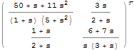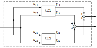 tf1 = TransferFunctionModel[{{s/(s^2 + 5), (3 s)/(s + 2)}, {(s + 1)/( s + 2), 2/s}}, s]; tf2 = TransferFunctionModel[{{10/(s + 1), 0}, {0, 5/(s + 3)}}, s]; SystemsModelParallelConnect[tf1, tf2]