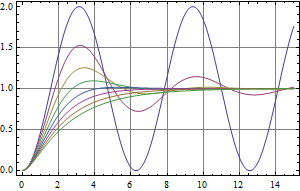 Plot[Evaluate@ Table[Tooltip[ OutputResponse[tf[1, \[Xi]], UnitStep[t], t], \[Xi]], {\[Xi], Range[0, 1.4, 0.2]}], {t, 0, 15}, Frame -> True, PlotRange -> All, ImageSize -> 300, GridLines -> Automatic]