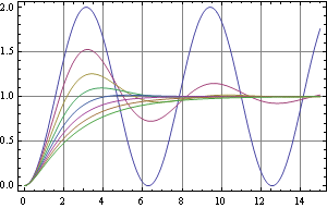 Отклик на скачок системы второго порядка при различных значениях коэффициента затухания.