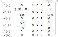 StateSpaceModel[{(M + m) x''[t] - m l Sin[\[Theta][t]] \[Theta]'[t]^2 + m l Cos[\[Theta][t]] \[Theta]''[t] == F[t], m x''[t] Cos[\[Theta][t]] + m l \[Theta]''[t] == m g Sin[\[Theta][t]]}, {{\[Theta][t], 0}, {\[Theta]'[t], 0}, {x[t], 0}, {x'[t], 0}}, {{F[t], 0}}, {\[Theta][t], x[t]}, t, SystemsModelLabels -> {"F[t]", {"\[Theta][t]", "x[t]"}, {"\[Theta][t]", "\[Theta]'[t]", "x[t]", "x'[t]"}}]