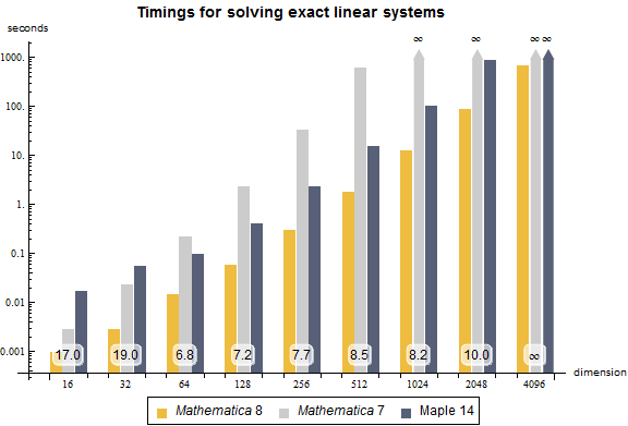 의 원소로 이루어진 선형 방정식의 풀이 시간을 나타낸 것입니다. 하이퍼스레딩이 가능한 인텔 쿼드코어 i7 940 2.93 GHz를 탑재한 64 비트 윈도우 비스타 시스템에서 수행한 연산이 1000 초에 종료하도록 실험이 행해졌습니다. 하단의 숫자를 보면 Maple 14과 비교하여