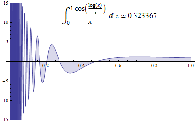 With[{sol = NIntegrate[1/x Cos[Log[x]/x], {x, 0, 1}]}, Plot[1/x Cos[Log[x]/x], {x, 0, 1}, PlotRange -> 15, Filling -> Axis, Epilog -> Inset[Style[ HoldForm[ Integrate[1/x Cos[Log[x]/x], {x, 0, 1}] \[TildeEqual] sol], 16], Scaled[{0.55, 1}], Top], ImageSize -> 400]]