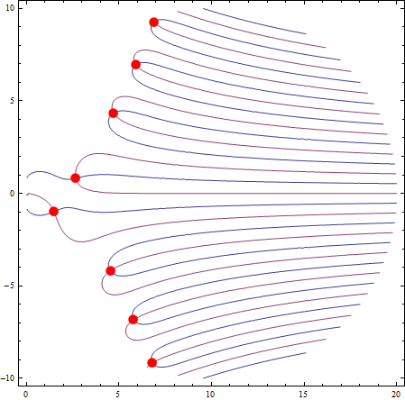 f = Gamma[z] - Log[z] - I/2; sol = NSolve[f == 0 && Abs[z - 10] < 10, z]; ContourPlot[{Re[f /. z -> x + I y] == 0, Im[f /. z -> x + I y] == 0}, {x, 0, 20}, {y, -10, 10}, RegionFunction -> (Abs[#1 + I #2 - 10] < 10 &), Epilog -> {Red, PointSize[0.025], Point[{Re[z], Im[z]}] /. sol}]