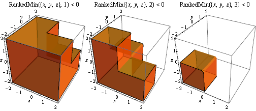 ParallelTable[ RegionPlot3D[ RankedMin[{x, y, z}, k] < 0, {x, -2, 2}, {y, -2, 2}, {z, -2, 2}, PlotLabel -> HoldForm[RankedMin][{x, y, z}, k] < 0, Mesh -> None, PlotStyle -> Directive[Opacity[0.7], Orange], BoundaryStyle -> Black, NormalsFunction -> None, PlotPoints -> 35, AxesLabel -> Automatic], {k, 1, 3}] // Row