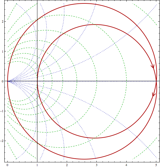 NyquistPlot[(10 s + 1)/(s^2 + 2 s + 1), PlotStyle -> Directive[Darker@Red, Thick], NyquistGridLines -> {{#, Directive[Dashed, Darker@Green]} & /@ Range[0.5, 0.9, 0.05], {#, Directive[Dotted, Darker@Blue]} & /@ (Range[-20, 20, 4] Degree)}, Frame -> True, GridLinesStyle -> {Yellow, Orange}]
