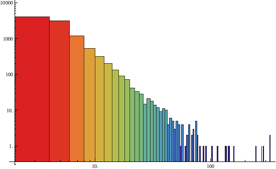 Histogram[ VertexDegree[RandomGraph[BarabasiAlbertGraphDistribution[10^4, 3]]], ColorFunction -> "Rainbow", ScalingFunctions -> {"Log", "Log"}]