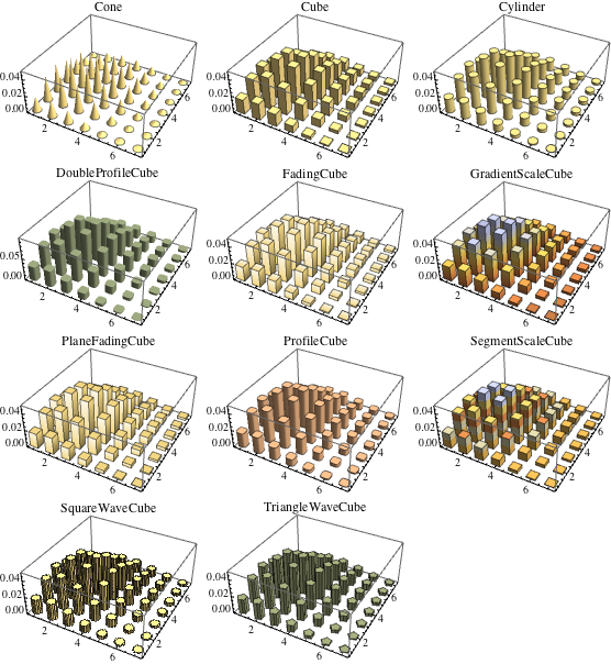 plots = ParallelTable[ DiscretePlot3D[ PDF[MultivariatePoissonDistribution[1, {2, 3}], {m, n}], {m, 7}, {n, 7}, PlotStyle -> ColorData["SandyTerrain", RandomReal[]], ExtentSize -> 0.5, ExtentElementFunction -> f, PlotLabel -> f], {f, Rest@ChartElementData[DiscretePlot3D]}];