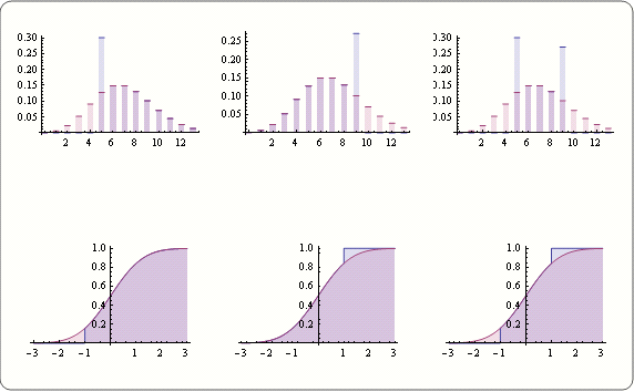 LeftCensored\[ScriptCapitalD] = CensoredDistribution[{5, \[Infinity]}, PoissonDistribution[7]]; RightCensored\[ScriptCapitalD] = CensoredDistribution[{-\[Infinity], 9}, PoissonDistribution[7]]; DoubleCensored\[ScriptCapitalD] = CensoredDistribution[{5, 9}, PoissonDistribution[7]]; g1 = Table[DiscretePlot[ Evaluate@{PDF[m, x], PDF[PoissonDistribution[7], x]}, {x, 0, 13}, ExtentSize -> 0.5], {m, {LeftCensored\[ScriptCapitalD], RightCensored\[ScriptCapitalD], DoubleCensored\[ScriptCapitalD]}}];