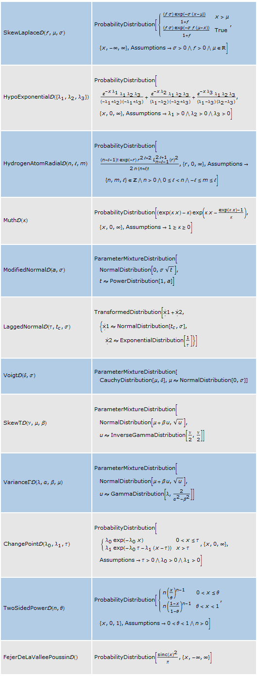 TraditionalForm@Text@Grid[ Function[dist, {HoldForm[dist], dist // TraditionalForm}, HoldAll] /@ Unevaluated[{ SkewLaplace\[ScriptCapitalD][\[ScriptF], \[Mu], \[Sigma]], HypoExponential\[ScriptCapitalD][{Subscript[\[Lambda], 1], Subscript[\[Lambda], 2], Subscript[\[Lambda], 3]}], HydrogenAtomRadial\[ScriptCapitalD][n, \[ScriptL], m], Muth\[ScriptCapitalD][\[Kappa]], ModifiedNormal\[ScriptCapitalD][a, \[Sigma]], LaggedNormal\[ScriptCapitalD][\[Tau], Subscript[t, c], \[Sigma]], Voigt\[ScriptCapitalD][\[Delta], \[Sigma]], SkewT\[ScriptCapitalD][\[Nu], \[Mu], \[Beta]], Variance\[CapitalGamma]\[ScriptCapitalD][\[Lambda], \[Alpha], \ \[Beta], \[Mu]], ChangePoint\[ScriptCapitalD][Subscript[\[Lambda], 0], Subscript[\[Lambda], 1], \[Tau]], TwoSidedPower\[ScriptCapitalD][n, \[Theta]], FejerDeLaValleePoussin\[ScriptCapitalD][] }], Alignment -> {Left, Center}, Background -> {None, {{Lighter[Blend[{Blue, Green, Blue}], 0.7], GrayLevel[.9]}}}, FrameStyle -> Directive[Thick, White], Dividers -> All, BaseStyle -> {FontFamily -> "Verdana"}, Spacings -> {{1, 1}, 4}]