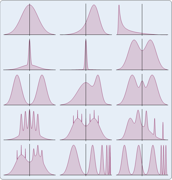 Gaussian = NormalDistribution[]; SkewedUnimodal = MixtureDistribution[{1/5, 1/5, 3/5}, {NormalDistribution[], NormalDistribution[1/2, 2/3], NormalDistribution[13/12, 5/9]}]; StrongSkew = MixtureDistribution[ConstantArray[1/8, 8], Table[NormalDistribution[3 ((2/3)^i - 1), (2/3)^i], {i, 0, 7}]]; KurtoticUnimodal = MixtureDistribution[{2/3, 1/3}, {NormalDistribution[], NormalDistribution[0, 1/10]}]; Outlier = MixtureDistribution[{1/10, 9/10}, {NormalDistribution[], NormalDistribution[0, 1/10]}]; Bimodal = MixtureDistribution[{1/2, 1/2}, {NormalDistribution[-1, 2/3], NormalDistribution[1, 2/3]}]; SeparatedBimodal = MixtureDistribution[{1/2, 1/2}, {NormalDistribution[-3/2, 1/2], NormalDistribution[3/2, 1/2]}]; SkewedBimodal = MixtureDistribution[{3/4, 1/4}, {NormalDistribution[], NormalDistribution[3/2, 1/3]}]; Trimodal = MixtureDistribution[{9/20, 9/20, 1/10}, {NormalDistribution[-6/5, 3/5], NormalDistribution[6/5, 3/5], NormalDistribution[0, 1/4]}]; Claw = MixtureDistribution[{1/2, 1/10, 1/10, 1/10, 1/10, 1/10}, Join[{NormalDistribution[]}, Table[NormalDistribution[i/2 - 1, 1/10], {i, 0, 4}]]]; DoubleClaw = MixtureDistribution[Join[{49/100, 49/100}, ConstantArray[1/350, 7]], Join[{NormalDistribution[-1, 2/3], NormalDistribution[1, 2/3]}, Table[NormalDistribution[(i - 3)/2, 1/100], {i, 0, 6}]]]; AsymmetricClaw = MixtureDistribution[Join[{1/2}, Table[(2^(1 - i))/31, {i, -2, 2}]], Join[{NormalDistribution[]}, Table[NormalDistribution[i + 1/2, (2^-i)/10], {i, -2, 2}]]]; AsymmetricDoubleClaw = MixtureDistribution[{46/100, 46/100, 1/300, 1/300, 1/300, 7/300, 7/300, 7/300}, Join[Join[Table[NormalDistribution[2 i - 1, 2/3], {i, 0, 1}], Table[NormalDistribution[-i/2, 1/100], {i, 1, 3}]], Table[NormalDistribution[i/2, 7/100], {i, 1, 3}]]]; SmoothComb = MixtureDistribution[Table[(2^(5 - i))/63, {i, 0, 5}], Table[NormalDistribution[(65 - (96 (1/2)^i))/21, (32/63)/2^i], {i, 0, 5}]]; DiscreteComb = MixtureDistribution[{2/7, 2/7, 2/7, 1/21, 1/21, 1/21}, Join[Table[NormalDistribution[(12 i - 15)/7, 2/7], {i, 0, 2}], Table[NormalDistribution[2 i/7, 1/21], {i, 8, 10}]]];