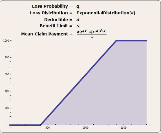 LossCDF = ((1 - q) + q (1 - E^(-a x))) HeavisideTheta[ x]; Loss\[ScriptCapitalD] = ProbabilityDistribution[{"CDF", LossCDF}, {x, -\[Infinity], \[Infinity]}, Assumptions -> a > 0 && 0 < q < 1]; PayoutFunction[x_] := Piecewise[{{0, x <= d}, {x - d, d < x < s + d}, {s, x >= s + d}}]; g = Plot[PayoutFunction[x] /. {d -> 400, s -> 1000}, {x, 0, 1800}, PlotStyle -> {Thickness[0.01]}, Filling -> Axis, Exclusions -> None]; Payout\[ScriptCapitalD] = TransformedDistribution[PayoutFunction[x], x \[Distributed] Loss\[ScriptCapitalD], Assumptions -> d > 0 && s > 0 && 0 < q < 1 && a > 0]; m = Mean[Payout\[ScriptCapitalD]];