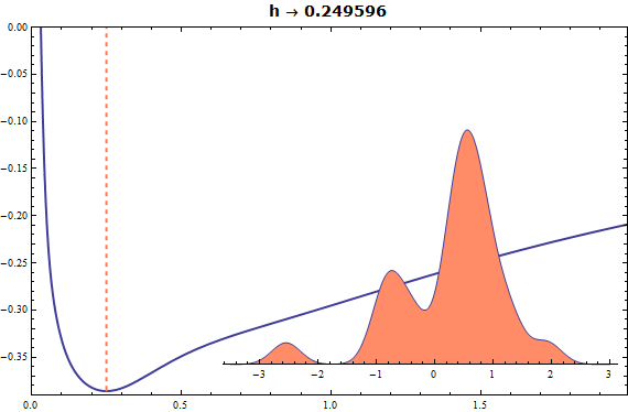 Impulse las capacidades simbólicas de KernelMixtureDistribution para resolver el ancho de banda de validación cruzada de mínimos cuadrados. Este método usa validación cruzada de dejar uno afuera para seleccionar un ancho de banda que minimiza el error cuadrado integrado de la estimación resultante.