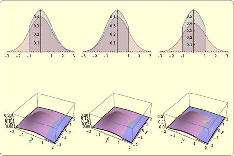 \[ScriptCapitalD] = ProductDistribution[NormalDistribution[], LaplaceDistribution[-1/2, 1]]; \[ScriptCapitalT]1 = TruncatedDistribution[{{-\[Infinity], 1}, {-\[Infinity], \[Infinity]}}, \[ScriptCapitalD]]; \ \[ScriptCapitalT]2 = TruncatedDistribution[{{-\[Infinity], \[Infinity]}, {-\[Infinity], 1}}, \[ScriptCapitalD]]; \[ScriptCapitalT]3 = TruncatedDistribution[{{-\[Infinity], 1}, {-\[Infinity], 1}}, \[ScriptCapitalD]]; g2 = Table[Plot3D[ Evaluate[{PDF[\[ScriptCapitalD], {x, y}], PDF[m, {x, y}]}], {x, -2, 2}, {y, -2, 2}, PlotStyle -> {Lighter@ColorData[1, 1], Directive[Lighter@ColorData[1, 2], Opacity[0.7]]}, PlotRange -> All, Lighting -> "Neutral", ExclusionsStyle -> Directive[Yellow, Opacity[0.5]], Mesh -> None, AxesLabel -> Automatic], {m, {\[ScriptCapitalT]1, \[ScriptCapitalT]1, \ \[ScriptCapitalT]3}}];