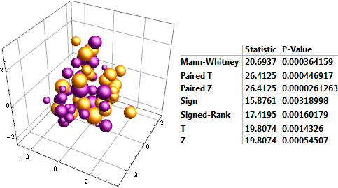 BlockRandom[SeedRandom[42]; data1 = RandomVariate[ MultinormalDistribution[{.25, .25, 0, .5}, IdentityMatrix[4]], 50]; data2 = RandomVariate[ MultinormalDistribution[{-.25, -.25, 0, .25}, IdentityMatrix[4]], 50]];