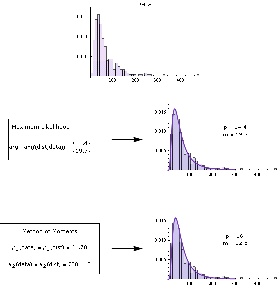 data = BlockRandom[SeedRandom[1234]; RandomVariate[HotellingTSquareDistribution[15, 20], 250]]; hist = Histogram[data, 50, "PDF", ImageSize -> 250, ChartStyle -> Directive[Opacity[.2], Hue[.742, .7, .7]]]; momentgrid = Grid[{{"Method of Moments"}, {"\!\(\*SubscriptBox[\(\[Mu]\), \(1\)]\ \)(data) = \!\(\*SubscriptBox[\(\[Mu]\), \(1\)]\)(dist) = " <> ToString[ Round[Mean[ data], .01]]}, {"\!\(\*SubscriptBox[\(\[Mu]\), \ \(2\)]\)(data) = \!\(\*SubscriptBox[\(\[Mu]\), \(2\)]\)(dist) = " <> ToString[Round[Moment[data, 2], .01]]}}, Frame -> True, Spacings -> {3, 2}]; mldist = EstimatedDistribution[data, HotellingTSquareDistribution[p, m]]; mmdist = EstimatedDistribution[data, HotellingTSquareDistribution[p, m], ParameterEstimator -> "MethodOfMoments"]; mlgrid = Grid[{{"Maximum Likelihood"}, \ {"argmax(\[ScriptL](dist,data)) = ", MatrixForm[Round[Apply[List, mldist], .1]]}}, Frame -> True, Spacings -> {0, 2}]; mlpdfplot = Show[hist, Plot[PDF[mldist, x], {x, 0, 300}, Filling -> Axis, ImageSize -> 250, PlotStyle -> {Hue[.742, .7, .7], Thick}], Epilog -> Style[Text[ "p = " <> ToString[Round[mldist[[1]], .1]] <> "\nm = " <> ToString[Round[mldist[[2]], .1]], {300, .01}], FontFamily -> "Verdana"]]; mmpdfplot = Show[hist, Plot[PDF[mmdist, x], {x, 0, 300}, Filling -> Axis, ImageSize -> 250, PlotStyle -> {Hue[.742, .7, .7], Thick}], Epilog -> Style[Text[ "p = " <> ToString[Round[mmdist[[1]], .1]] <> "\nm = " <> ToString[Round[mmdist[[2]], .1]], {300, .01}], FontFamily -> "Verdana"]]; arrow = Graphics[{Thick, {Arrowheads[Large], Arrow[{{0, 0}, {1, 0}}, .2]}}]; Column[{Show[hist, PlotLabel -> Style["Data", FontFamily -> "Verdana"]], Style[Grid[{{mlgrid, arrow, mlpdfplot}, {momentgrid, arrow, mmpdfplot}}, Spacings -> 0], FontFamily -> "Verdana"]}, Alignment -> Center]