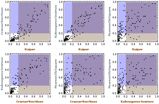 Монте-Карло симулирование, сравнивающее мощности четырёх критериев согласия. Точки в белой области соответствуют правильному заключению в обоих тестах. Точки сверху или справа от белой области отвечают ошибке второго типа, совершённой тестом, отвечающей, соответственно, вертикальной и горизонтальной осям.