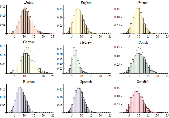 Partition[ Table[Show[ Histogram[worddata[[i]], {Range[25] - 1/2}, "PDF", PlotLabel -> languages[[i]], ChartStyle -> Directive[Opacity[.2], ColorData[35, i]]], DiscretePlot[PDF[binom[[i]], x], {x, 0, 25}, PlotRange -> All, PlotStyle -> {{PointSize[.02], Darker@ColorData[35, i]}}]], {i, Length[languages]}], 3] // Grid