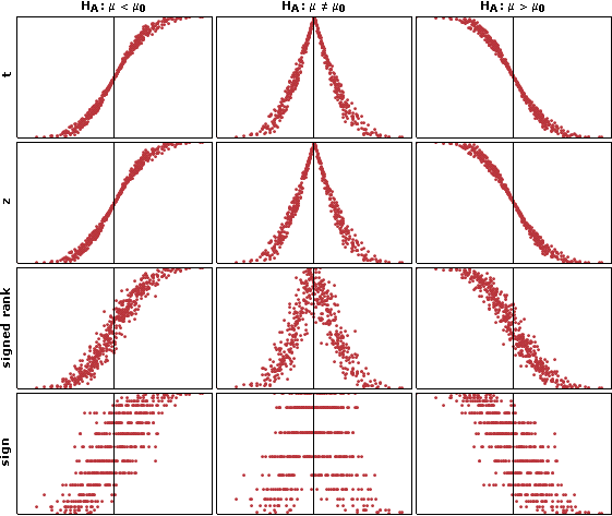 tests = {"T", "Z", "SignedRank", "Sign"}; alts = {"Less", "Unequal", "Greater"}; res = Table[(Quiet@ LocationTest[#1, 0, i, AlternativeHypothesis -> j, VerifyTestAssumptions -> None] &) /@ data, {i, tests}, {j, alts}]; m = Mean /@ data; Grid[Join[{Map[ Style[#, Bold, FontFamily -> "Verdana"] &, {"", "\!\(\*SubscriptBox[\(H\), \(A\)]\): \[Mu] < \!\(\*SubscriptBox[\ \(\[Mu]\), \(0\)]\)", "\!\(\*SubscriptBox[\(H\), \(A\)]\): \[Mu] \[NotEqual] \ \!\(\*SubscriptBox[\(\[Mu]\), \(0\)]\)", "\!\(\*SubscriptBox[\(H\), \(A\)]\): \[Mu] > \!\(\*SubscriptBox[\ \(\[Mu]\), \(0\)]\)"}]}, Join[Partition[ Thread[Rotate[ Map[Style[#, Bold, FontFamily -> "Verdana"] &, {"t", "z", "signed rank", "sign"}], \[Pi]/2]], 1], Table[ListPlot[Transpose[{m, res[[i, j]]}], FrameTicks -> None, Frame -> True, PlotRange -> {{-.5, .5}, {0, 1}}, PlotStyle -> Hue[.992, .7, .7]], {i, 4}, {j, 3}], 2]], Spacings -> {.25, .25}]