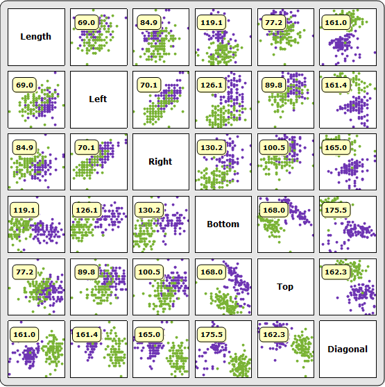 de Hotelling en varios pares de mediciones para notas bancarias suizas falsas y genuinas para seleccionar el mejor par de indicadores de que un billete es falso.| In[1]:= | ![]() X |