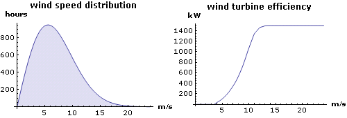 Row[{Plot[24 365 PDF[dist, x], {x, 0, 24}, AxesLabel -> (Style[#, Bold] &) /@ {"m/s", "hours"}, Filling -> Axis, BaseStyle -> {FontFamily -> "Verdana"}, PlotLabel -> (Style[#, 12, Bold] &)@"wind speed distribution", ImageSize -> 250], Plot[turbine[x], {x, 0, 24}, AxesLabel -> (Style[#, Bold] &) /@ {"m/s", "kW"}, BaseStyle -> {FontFamily -> "Verdana"}, PlotLabel -> (Style[#, 12, Bold] &)@"wind turbine efficiency", ImageSize -> 250]}]