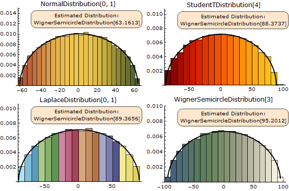 dists = {NormalDistribution[], StudentTDistribution[4], LaplaceDistribution[0, 1], WignerSemicircleDistribution[3]}; ev = Eigenvalues[RandomSymmetricMatrix[#, 10^3]] & /@ dists; edist = EstimatedDistribution[#, WignerSemicircleDistribution[r]] & /@ ev;